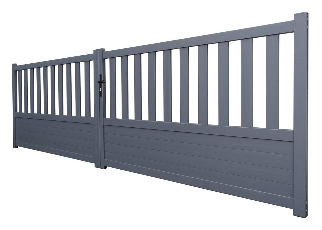 Le portail Manchester est également disponible en blanc ou entièrement plein sans lames biseautées (gris uniquement).